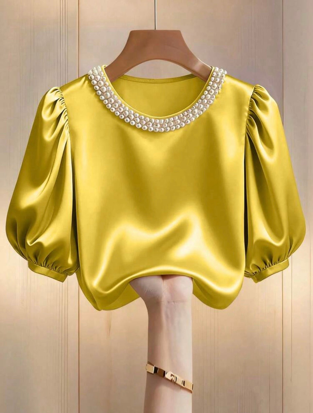 Doté de manches bouffantes délicates, ce modèle allie modernité et élégance. Son col rond est subtilement orné de perles, ajoutant une finition sophistiquée et féminine qui attire tous les regards.